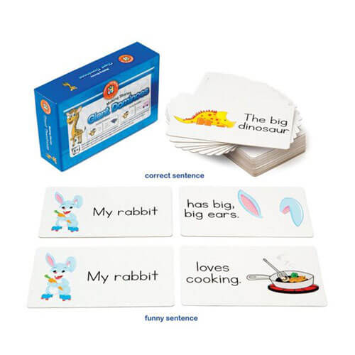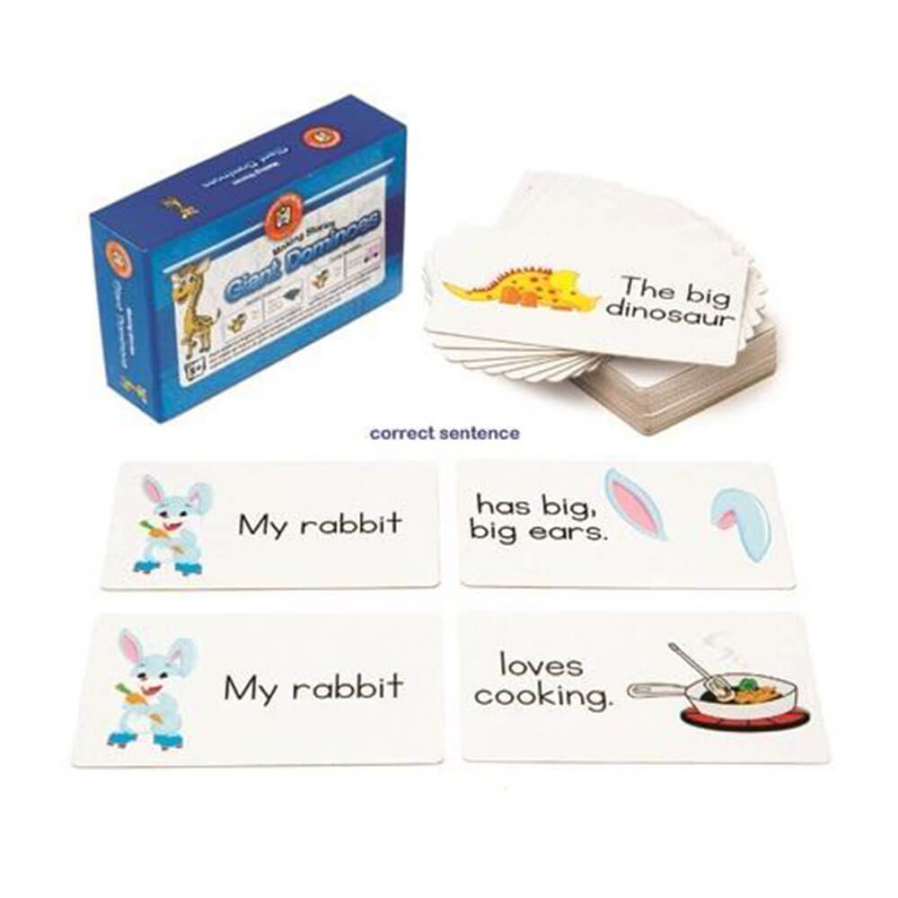 Dieses Lernen kann Spaß machen. Das Erfinden von Geschichten macht Spaß. Dominosteine sind perfekt, um neuen Lernenden bei der Entwicklung ihrer Sprachkenntnisse zu helfen. Die Dominosteine enthalten eine Vielzahl von Wörtern und Phrasen, die zu lustigen Sätzen kombiniert werden können, die dann laut vorgelesen, aufgeschrieben oder ausgedruckt werden können.