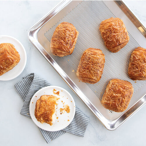 Das perforierte Crisping-Halbblech von Nordic Ware besteht aus reinem Aluminium für eine hervorragende Wärmeleitfähigkeit und sorgt jedes Mal für gleichmäßig gebräunte Backwaren. Darüber hinaus ist der durch die winzigen Löcher dieser Pfanne erzeugte Luftstrom ideal, wenn Sie eine knusprige äußere Kruste für Ihre Backwaren wie Brot, Croissants, Brötchen, Pizza, Brezeln und mehr wünschen.