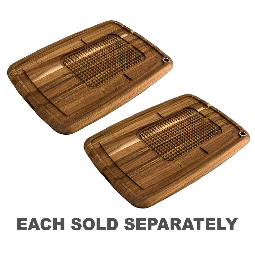 Dieses Tranchierbrett ist aus reich gemasertem Akazienholz gefertigt und verfügt über eine große strukturierte Oberfläche Das stabilisiert ganze Hähnchen und Roastbeef während des Tranchiervorgangs, während die großen Rillen losen Saft auffangen und Ihre Küchenarbeitsplatten makellos halten.