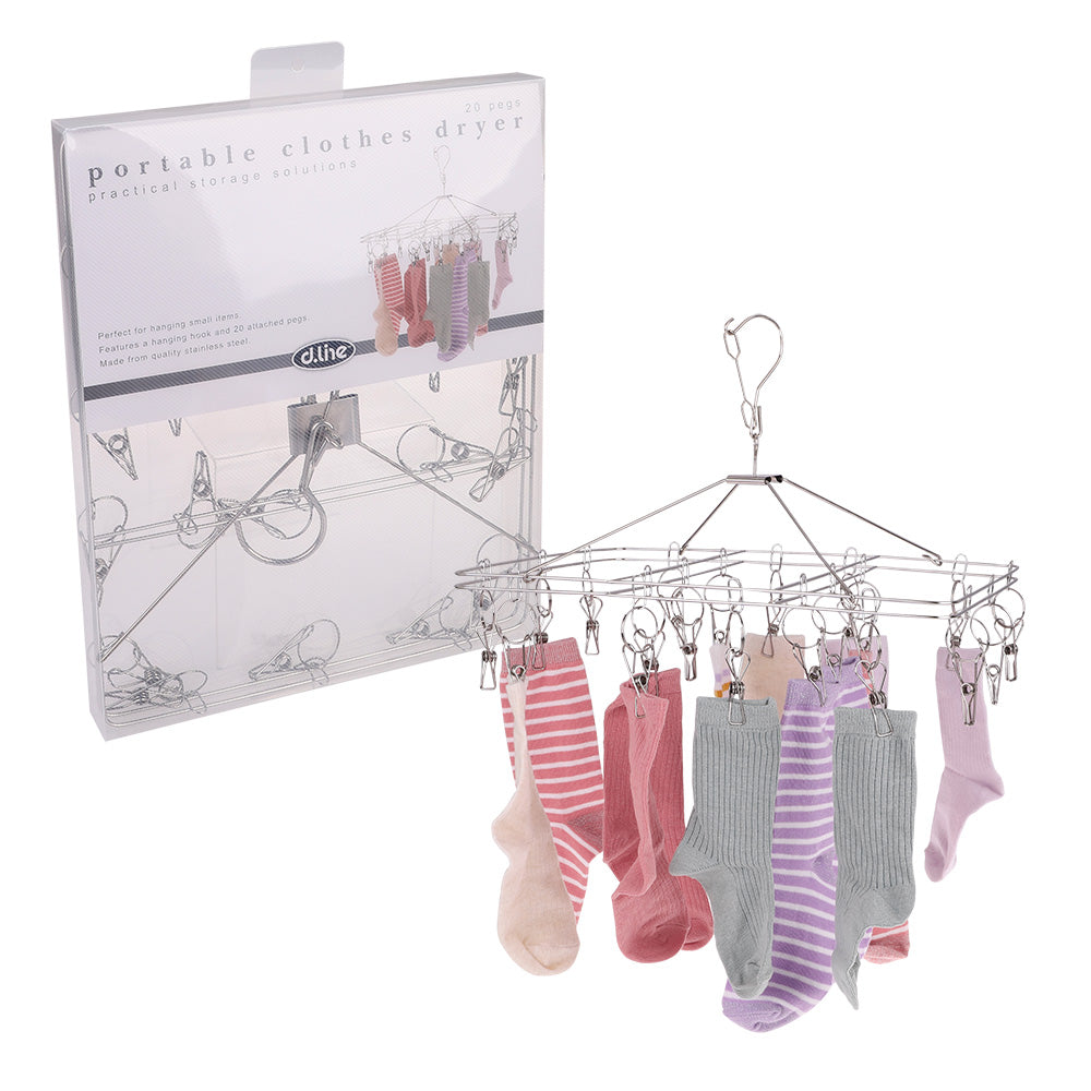 This Stainless Steel Rectangle Clothes Dryer - 20 pegs from d.line is perfect for hanging small items, even in the most compact space. Featuring a hanging hook and 20 attached pegs, this compact dryer is great for travelling, and folds away for easy storage.