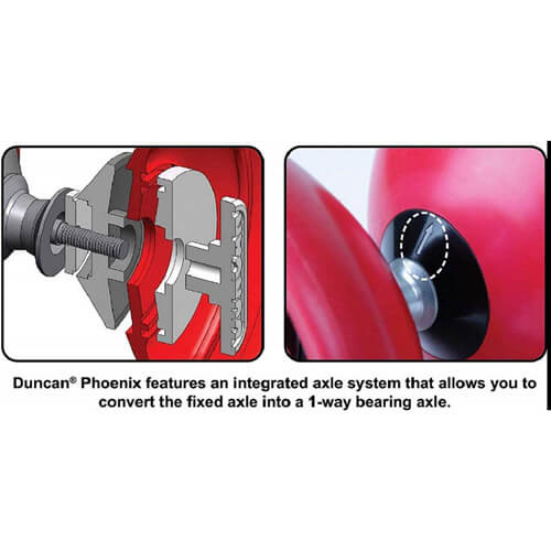 • Udskiftelig leje: Ikke længere skal Diabolo-spillere vælge mellem en fast aksel og 1-vejs bærende Diabolo. Den unikke Duncan Phoenix Diabolo udskiftelig lejedesign giver dig mulighed for nemt at udlevere knapperne til at skifte aksler mellem fast og spinding.
