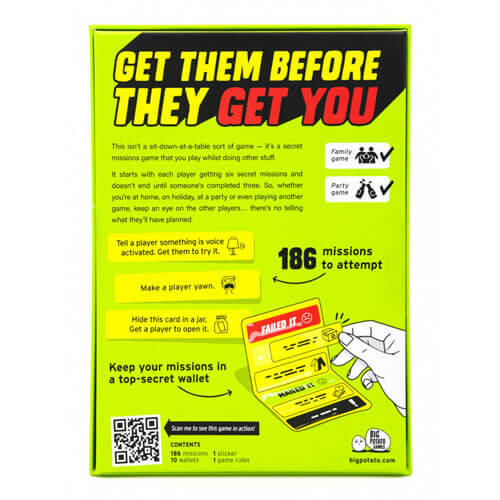 Med over 180 forskellige missioner, der kan forsøges i masser af forskellige scenarier, er dette et af disse festspil for både voksne og teenagere. For at starte med får hver spiller en mission tegnebog med seks missionskort, som de holder hemmelige for nogen anden.
