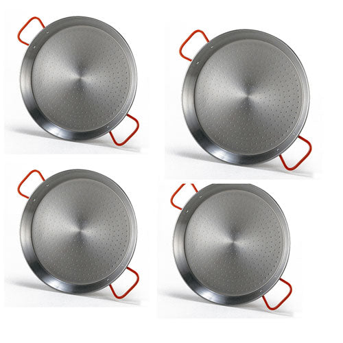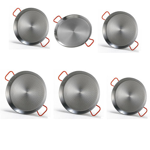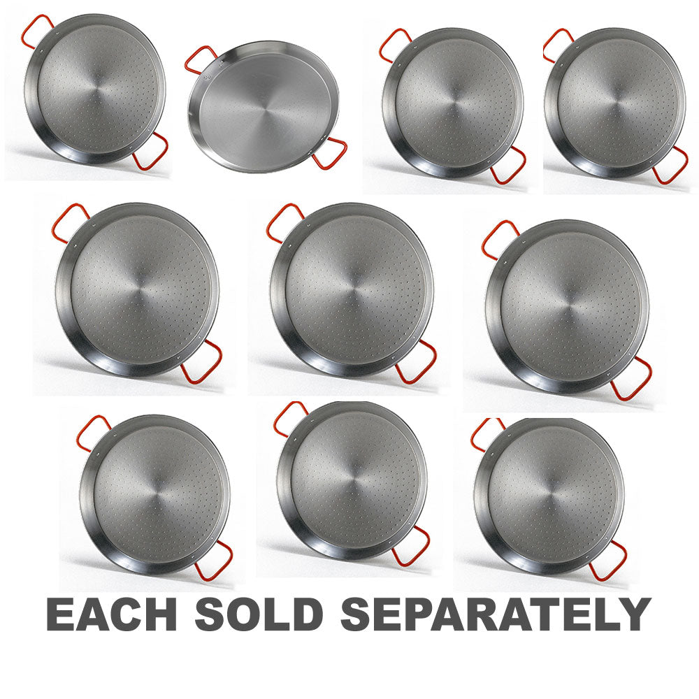 Create legendary paella with this authentic Spanish-made pan, for a supreme traditional cooking experience. Enjoy making Spain's most iconic recipe, originally invented by rural workers and prepared outdoors with seasonal ingredients. Whether you're creating a vegetarian, seafood or mixed meat masterpiece, Garcima's traditional paella pans are designed to make cooking this delectable dish a breeze. The round, wide, low design of the paella pan allows food to cook quickly over a high heat, the angled sides make ingredients accessible for stirring and their oversized handles let the home cook safely and easily transfer food from cooktop to table. This instantly recognisable red-handled, hand-spun pan is made of thin, high carbon polished steel that responds quickly to temperature changes. Suitable for use on electric and gas cooktops, as well as outside on an open flame or charcoal grill.
