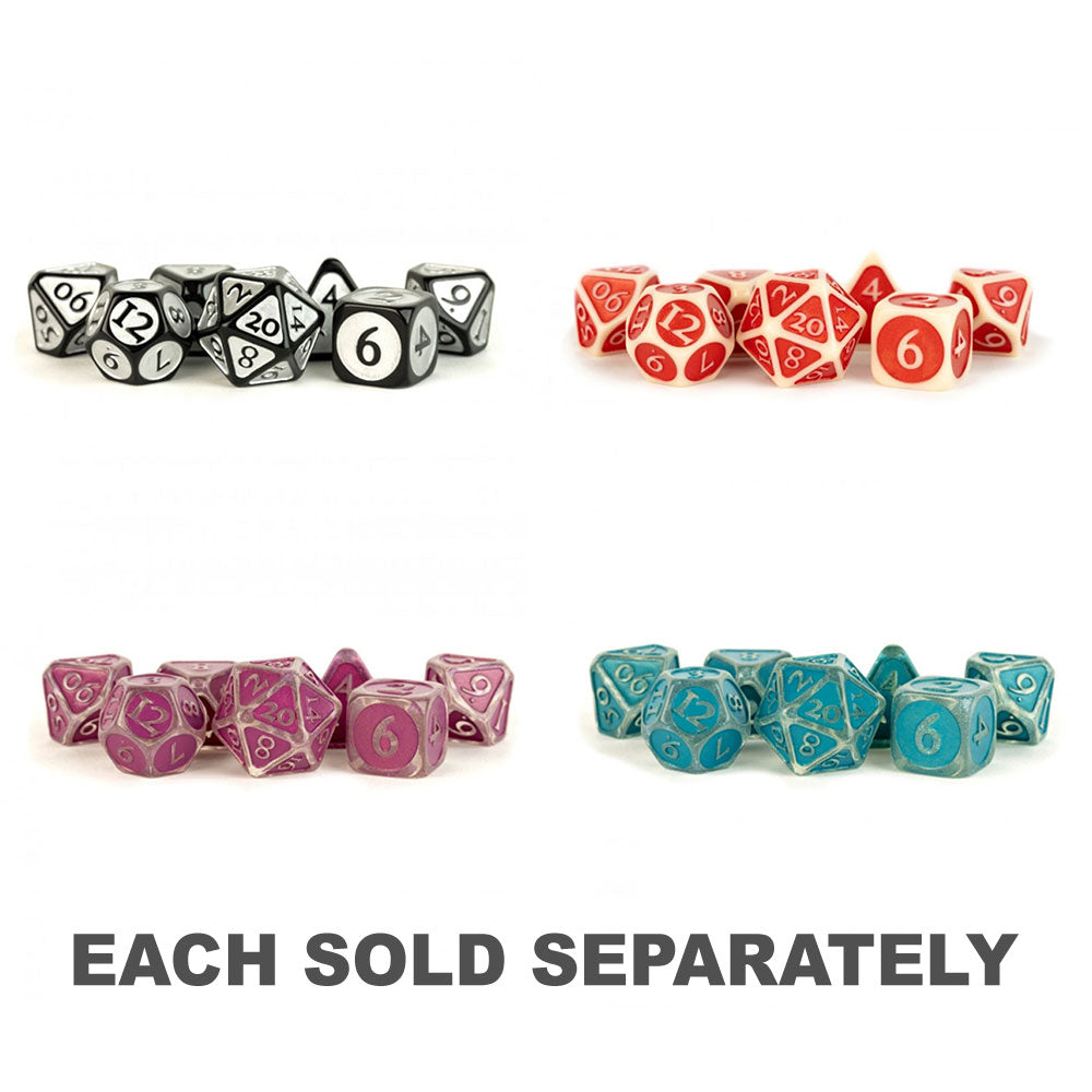 Each set is molded in acrylic and then carefully filled with beautiful enamel paint. We do recommend rolling any metal dice on padded surfaces like padded dice trays.