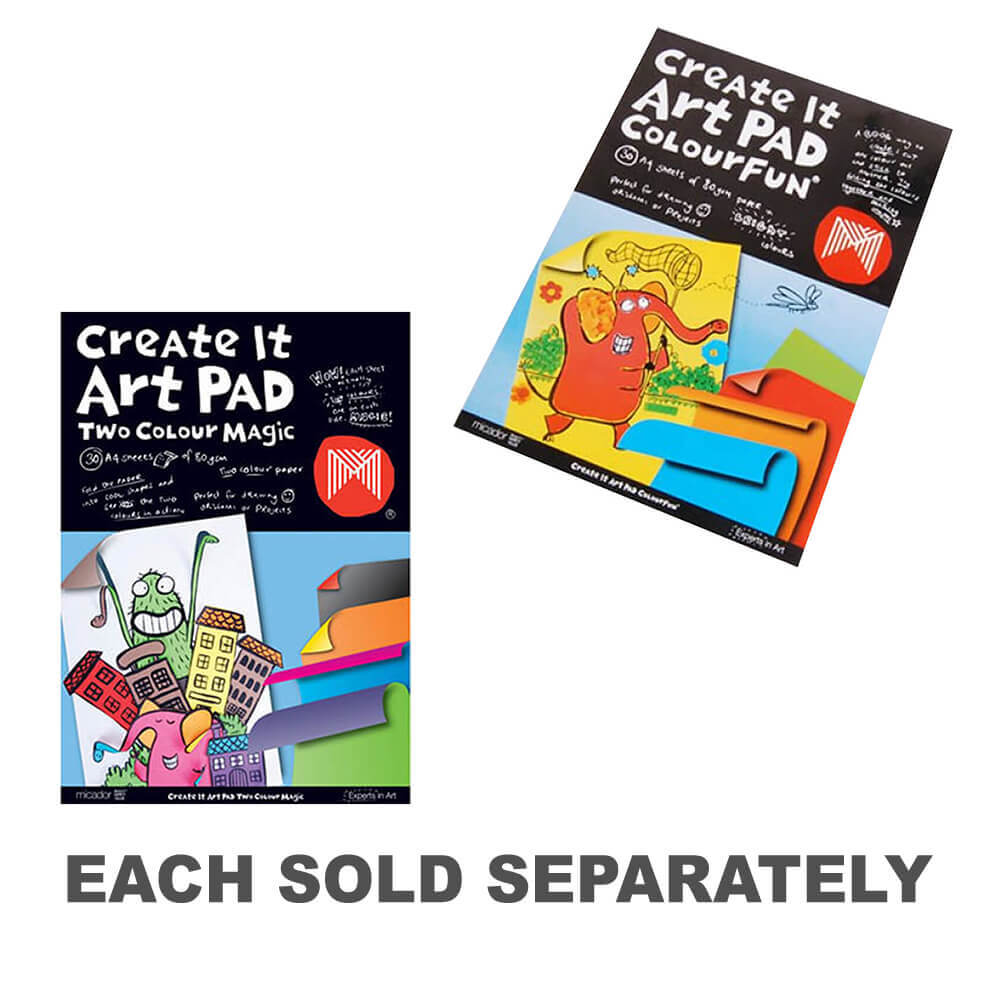 A4 Art Pads with 30 easy tear sheets of quality, acid free paper suitable for kids drawing, scrapbooking, craft projects and origami. 80gsm. Available in 3 different styles. Colourfun five vibrant colours (aqua blue, red, orange, yellow and green). Two colour magic 10 colours, with a different colour to each side of the sheet (purple/green, yellow/orange, pink/blue, red/black and brown/white. Black and white paper. Alternating 5 sheets of white paper and 5 sheets of black paper.