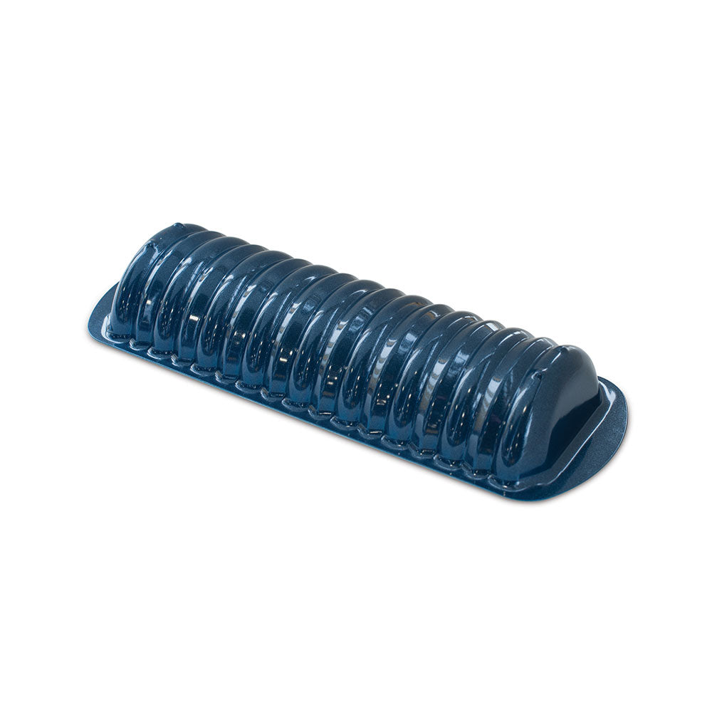 Our line of professional heavyweight bakeware is constructed of aluminized steel, which disperses heat evenly for terrific results, and will not rust or warp in the oven. The collection includes pieces for all baking needs and features premium non-stick interiors with bright, colorful exteriors for oven-to-table serving. Bake quick breads and traditional Scandinavian almond cakes in this classic ribbed pan. 4-cup capacity.