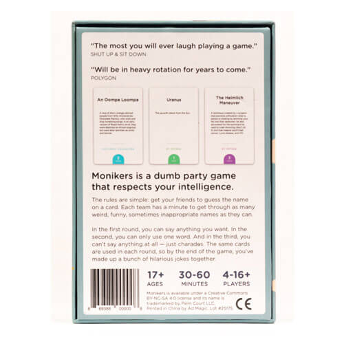 Monikers es un juego de fiesta basado en la celebridad del juego de dominio público, donde los jugadores se turnan para que sus compañeros de equipo adivinen nombres describiendo o imitando a personas conocidas.