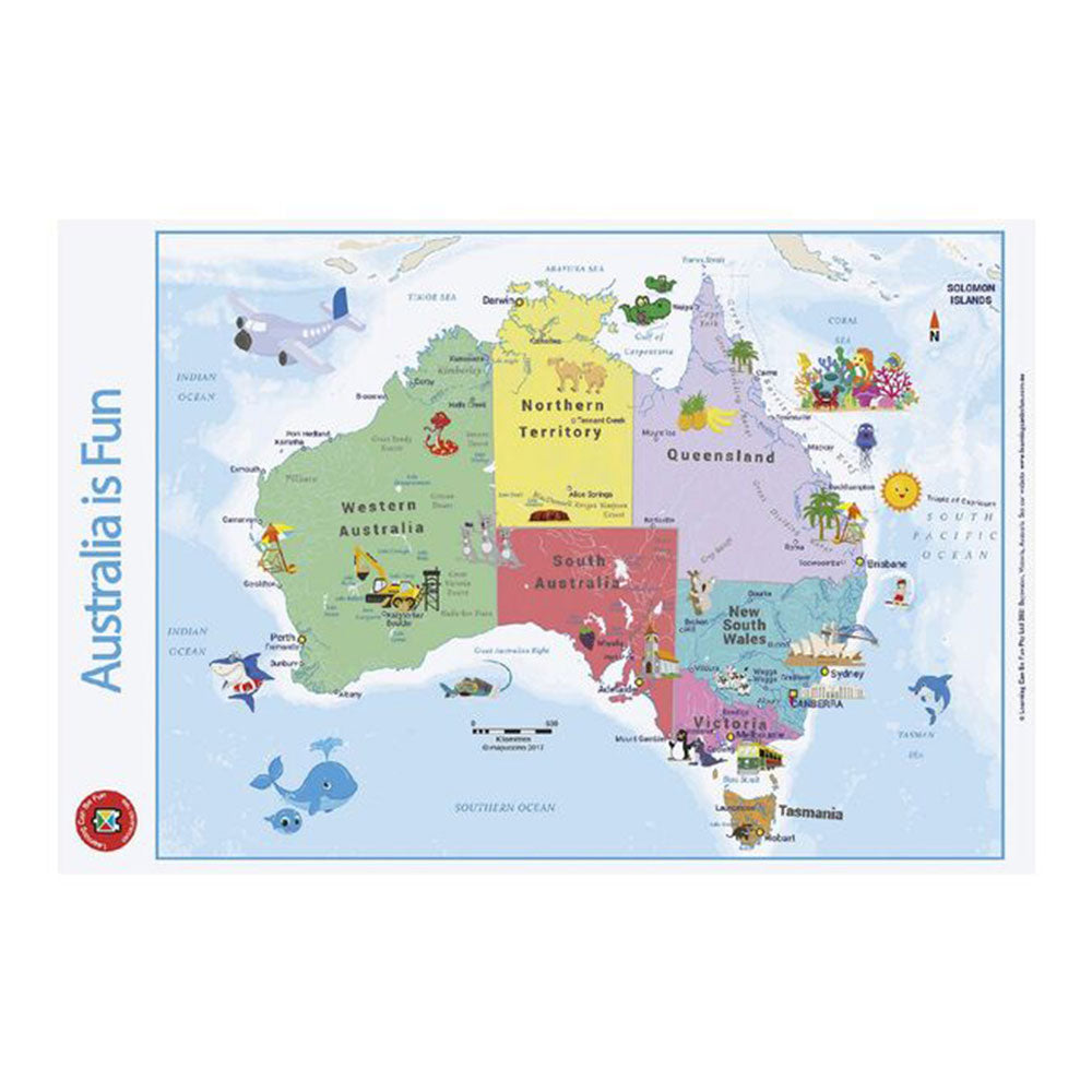 - Es verfügt über eine Karte Australiens mit auffälligen Grafiken, die einige der bekanntesten natürlichen und kulturellen Attraktionen und Tiere des Landes darstellen.