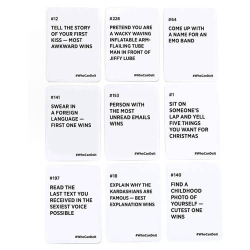 WER KANN ES SCHAFFEN... enthält 250 Aktionskarten, um zu sehen, wer in der Gruppe es schaffen kann! Treten Sie gegen Ihre Freunde an, um den besten Eindruck vom Richter zu hinterlassen, trinken Sie ein Glas Wasser mit einem Löffel und ändern Sie den Hintergrund Ihres Telefons in ein Foto eines kahlköpfigen Mannes.
