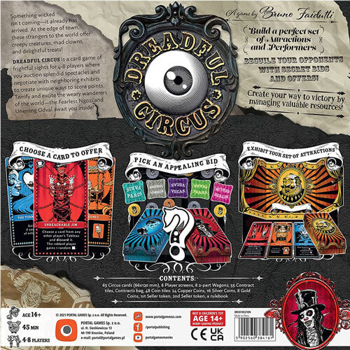 Dorderful Circus è un gioco di raccolta set in cui stai cercando di creare il circo di maggior successo! Il gioco viene fornito con una svolta unica: nel corso del gioco i giocatori acquistano carte con regole di punteggio finali uniche. Man mano che il gioco avanza e si ottengono sempre più carte, ogni giocatore ha sviluppato le proprie regole finali di punteggio. Nessun gioco è lo stesso, nessun giocatore al tavolo segna allo stesso modo. È un concetto unico in cui i giocatori, nel numero di round, costruiscono il modo in cui segnerà alla fine. Il terribile circo è progettato dall'icona del settore Bruno Faidutti, è per 4-8 giocatori e gioca in 30-40 minuti. Il gioco è un gioco di carte estremamente intelligente per i giocatori.