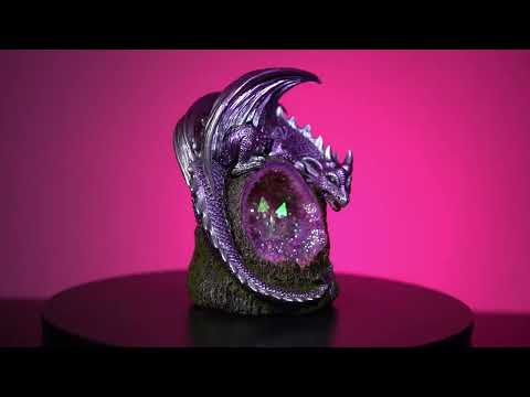 Magical Backflow Incenso Burner con un drago viola metallico arricciato attorno a un moncone. Geode scintillante circonda tre cristalli importanti. Scultura e colore dettagliati. Cambiare LED rendono questo bruciatore un bellissimo ornamento funzionale.