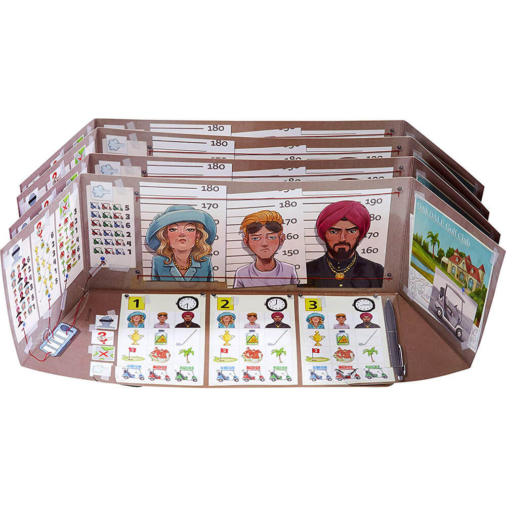 - 内容:4つのブリーフケーススクリーン、消しゴムを備えた4つのドライエラーゼマーカー、4つの調査ファイル、9つの木製キー、1つのソリューションボード、190カード:100の証人声明、90枚18個のAlibiカード)。