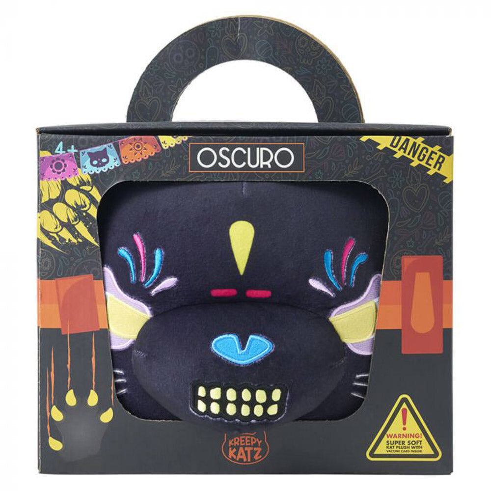 Super soft 30cm Kreepy Katz Frankenkitty head plush with curly tail. Presented in a cardboard branded cat carrier with handle and vaccine card inside. Features embroidered facial details. Collect all six Kreepy Katz in Series 1.