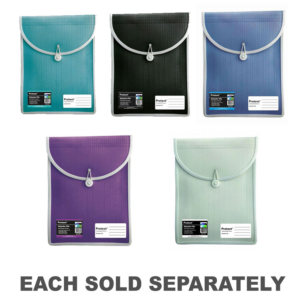 Protext Attache -bestanden hebben een streepafwerking met stijlvolle witte trim. Uitbreidbare Gussett past op een reeks kopiepapier. Beveilig elastische sluiting. Gedrukt paneel naar voren om de inhoud te detailleren