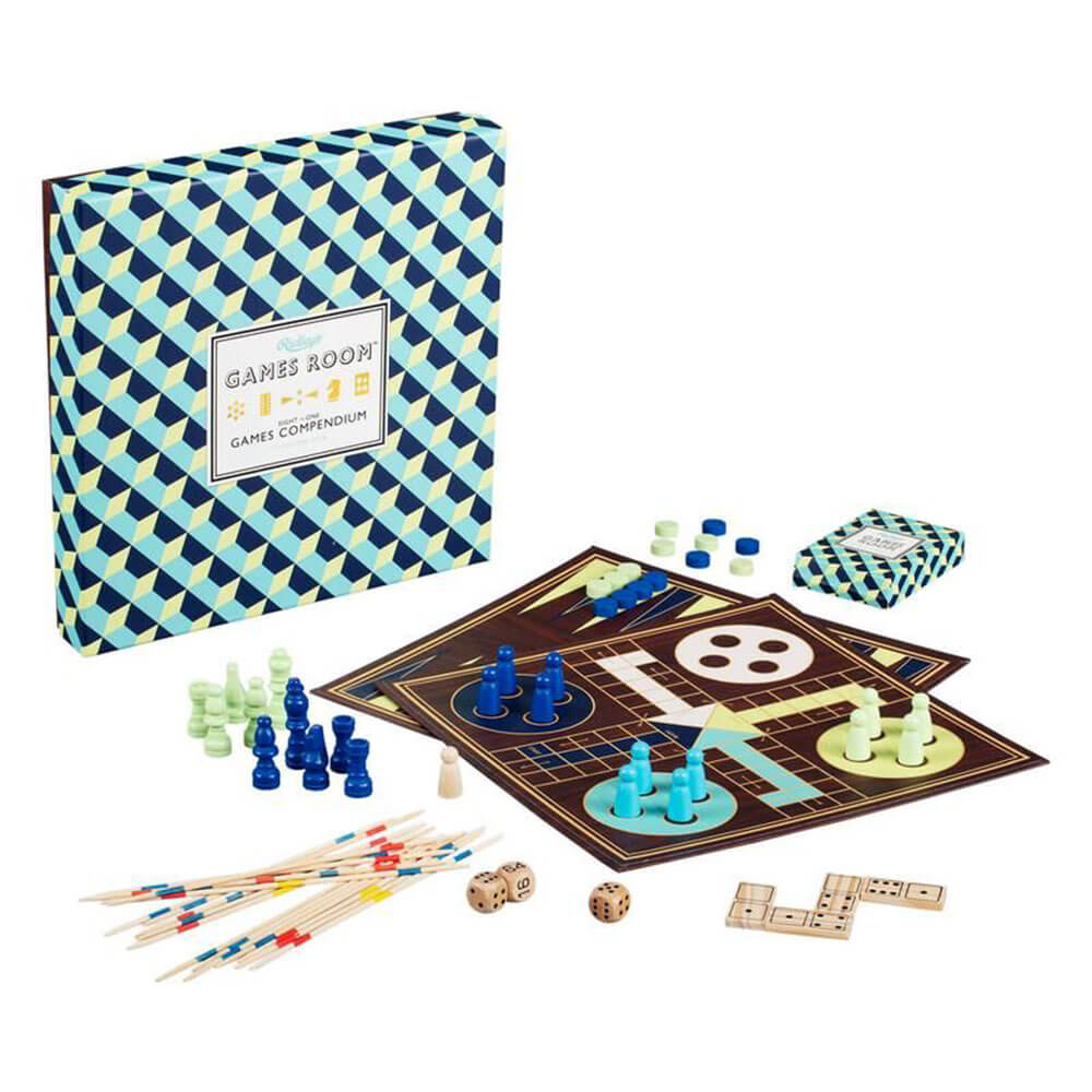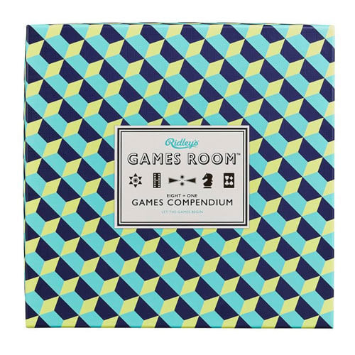 Miej klasyczną noc gier z tym kompendium z gier Ridleya! Kompendium ośmiu w jeden. Pakowane w geometrycznym pudełku do druku. Zawiera Backgammon, Szachy, Chińskie Checkery, Domino, szkice/warcaby, Ludo, patyki, karty do gry i instrukcje.