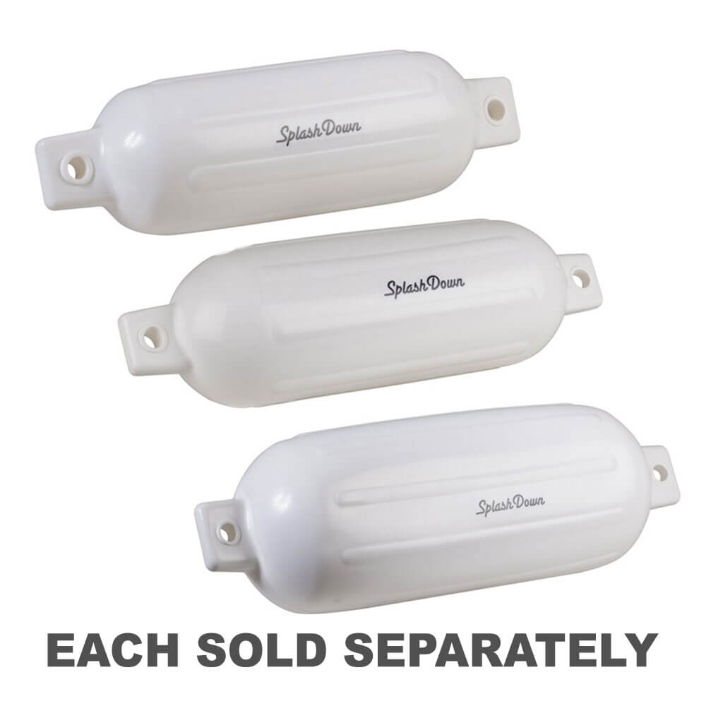Jeder Fender hat an jedem Ende eine große Öse. (In den USA und Kanada werden die Kotflügel im Allgemeinen festoonartig und nicht vertikal befestigt, was ein Wegrollen zusätzlich verhindert). Es stehen 4 Größen zur Verfügung, alle in der Farbe Weiß.