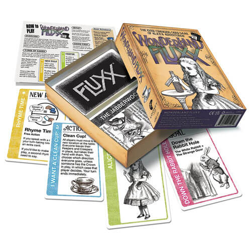In „Wonderland Fluxx“ können Sie in den Kaninchenbau gehen und sich Alice anschließen, während sie mit dem verrückten Hutmacher Tee trinkt, Anweisungen von der Grinsekatze erhält, versucht, mit Tweedle Dee und Tweedle Dum zur Vernunft zu kommen, und dabei besorgniserregend wächst und schrumpft. Möglicherweise müssen Sie sogar einen Jabberwock töten, um bei dieser noch seltsameren Version von Fluxx zu gewinnen ...