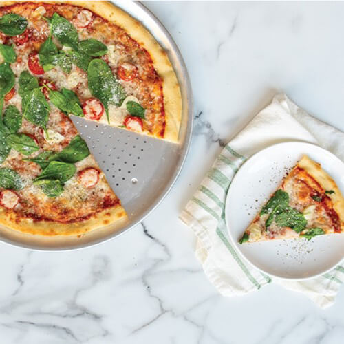 Há uma razão pela qual os restaurantes servem pizza em panelas como esta: o alumínio é o melhor material para aquecer e atua como um escudo para evitar a queima. O fluxo de ar criado pelos pequenos buracos desta panela garante crostas perfeitamente crocantes. Os pés nubby fornecem estabilidade de corte.