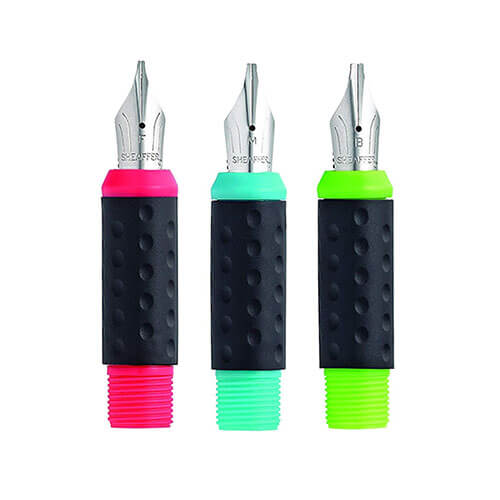 - Tre färgkodade nibs för strokevariation: fin nib (rosa), medium nib (kricka), bred nib (lime grön)